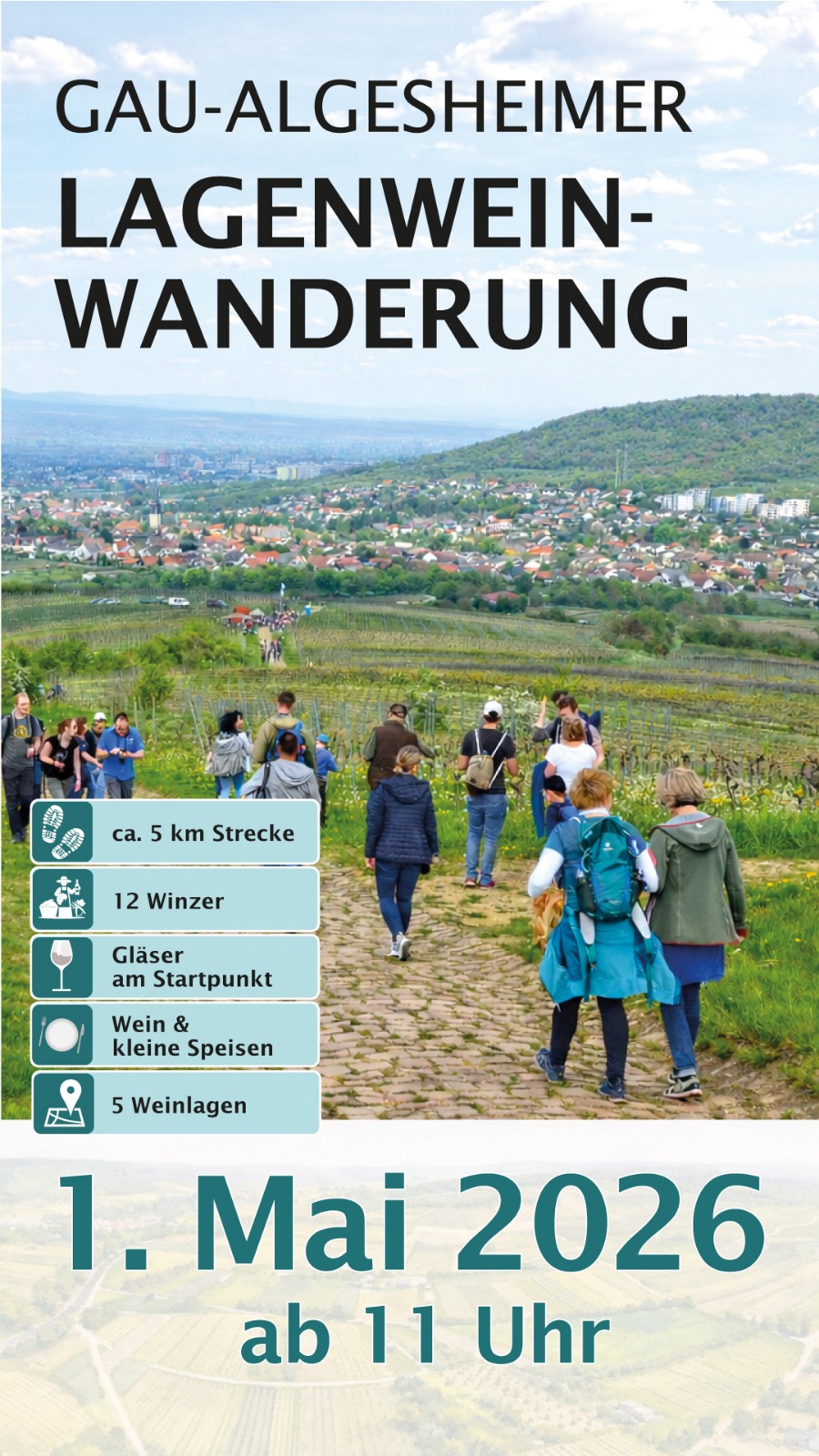 Bei einer Wanderung durch die Gau-Algesheimer Weinberge in den Lagen Steinert, Goldberg, Johannisberg, Rothenberg und Laurenzikapelle können Sie die Weine von insgesamt 12 Winzern probieren. Passend zu Weinen der Lagen gibt es an den verschiedenen Ständen auch Leckereien, um Kraft zu tanken für den weiteren Weg, der über 5 km führt. Zu den Lagen erhalten Sie Informationen über das jeweilige Terroir und können probieren, wie sich dies auf den Wein auswirkt. (Gläser gibt es nur am Startpunkt.)